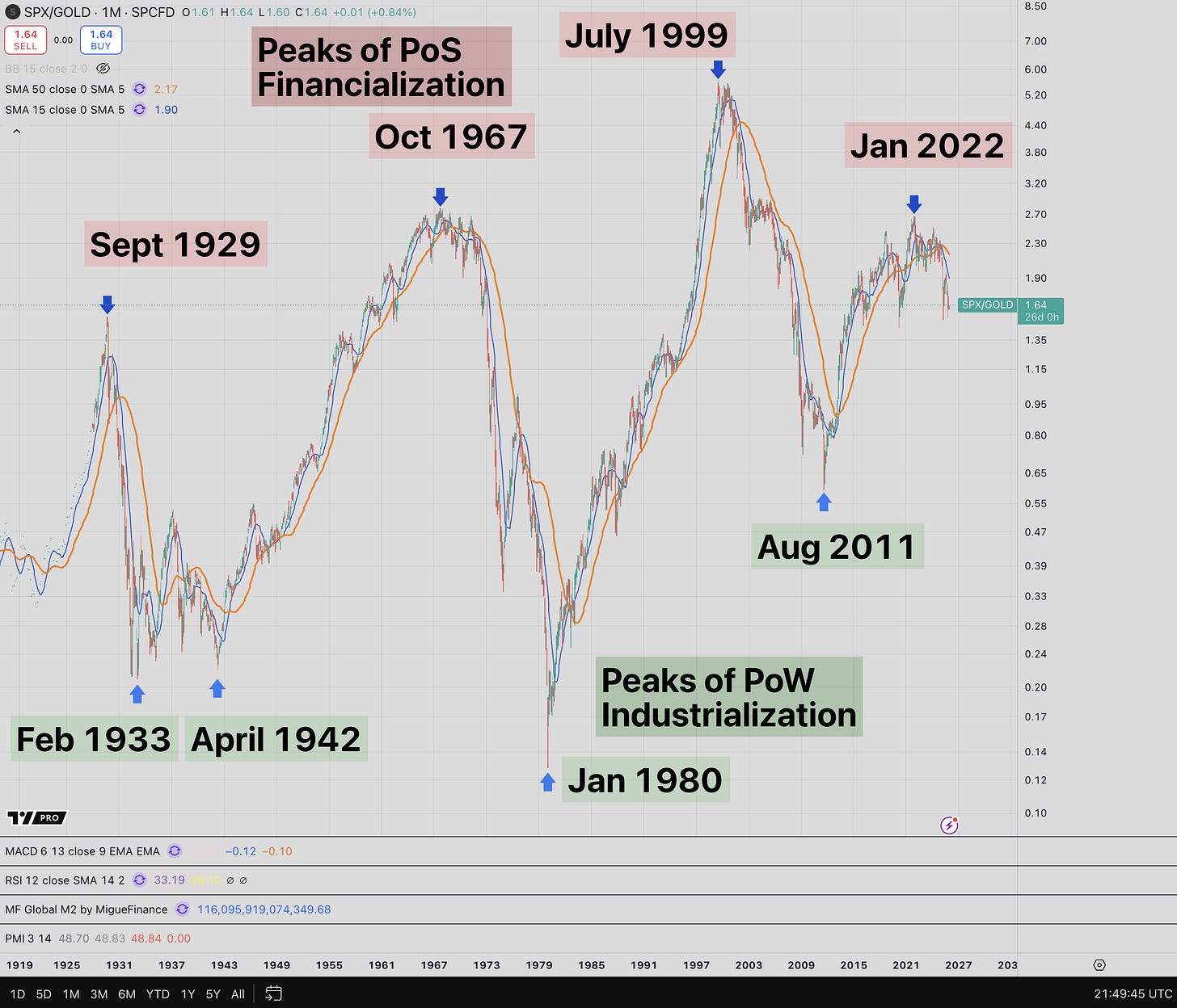 The S&P 500 measured in gold ounces instead of dollars. After financialization peaked in January 2022, we are now trending toward industrialization. Chart credit to Dr. Jeff Ross.