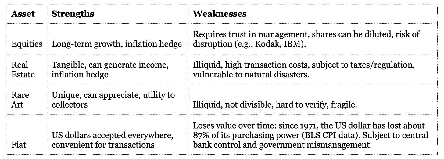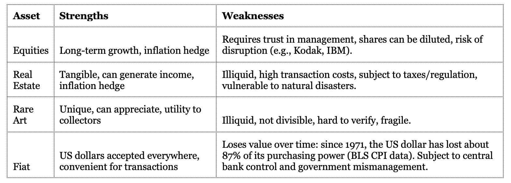 Let’s compare Bitcoin with other popular stores of value, highlighting both strengths and weaknesses: